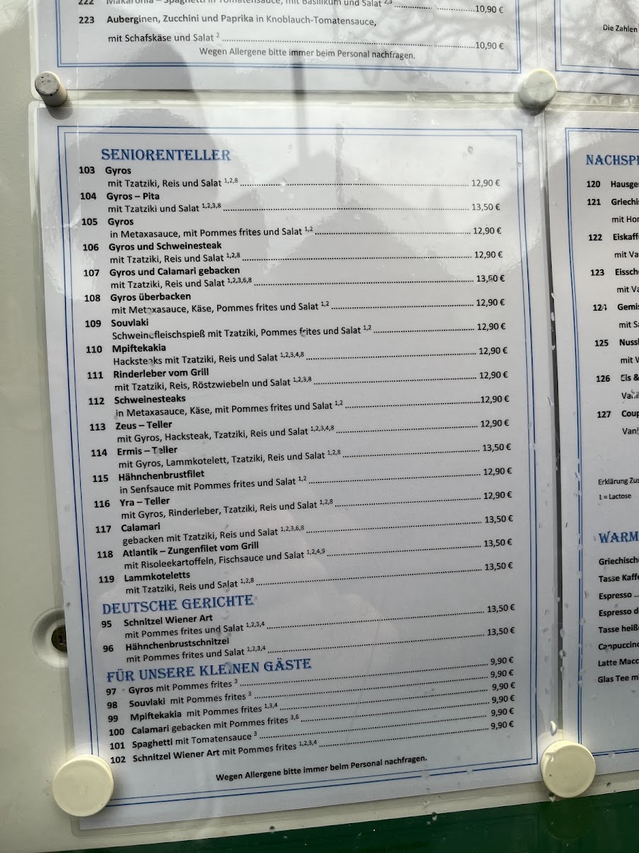 Guests can enjoy traditional specialties such as Gyros served with rice or Metaxa sauce, tender Lammkoteletts, and fresh Seefisch selections like Dorade. A variety of warm and cold appetizers, including the Warme Vorspeisenplatte for two, invite relaxed conversation and a taste of Greek hospitality. To complement the meal, a choice of drinks like the classic anise-flavored Ouzo or a refreshing Green Tea help create a balanced dining experience.